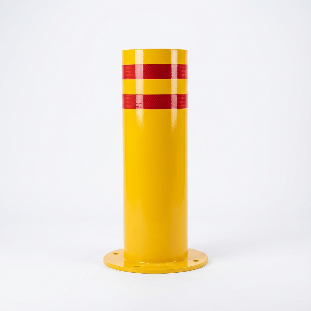 Pilona de alta seguridad fija amarilla doble cinta reflectantes con placa de 220mm diametro 750mm de altura